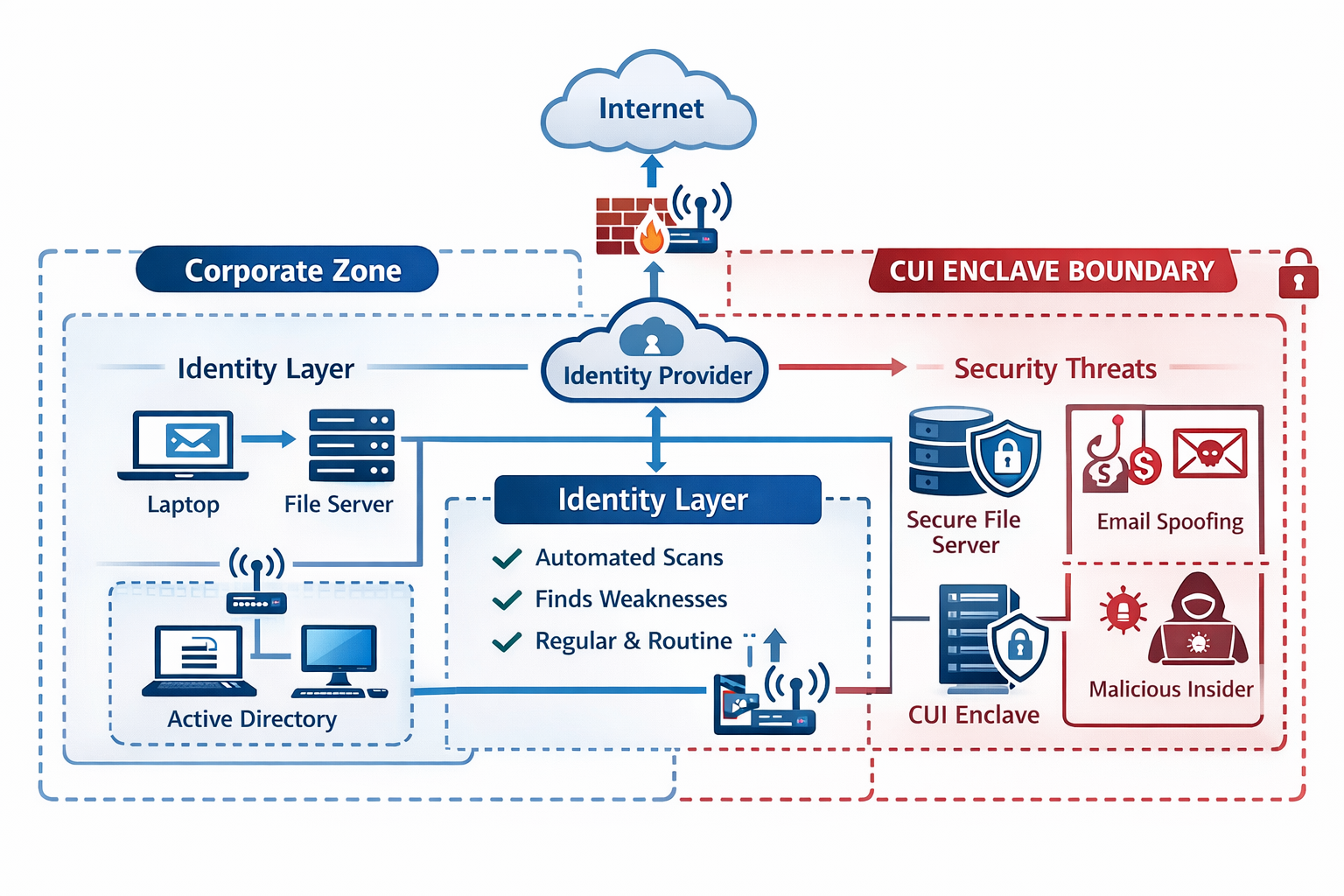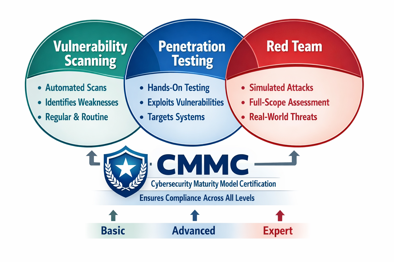 CMMC penetration testing is a structured, authorized simulation of real attacker behavior against the systems in your CMMC assessment scope, often a CUI enclave. Unlike a basic vulnerability scan, a CMMC aligned penetration test is designed to produce actionable findings plus assessor friendly evidence so you can show that security controls are operating as intended, not just checked on paper. It focuses on how an attacker would actually break in, move laterally, and access CUI.