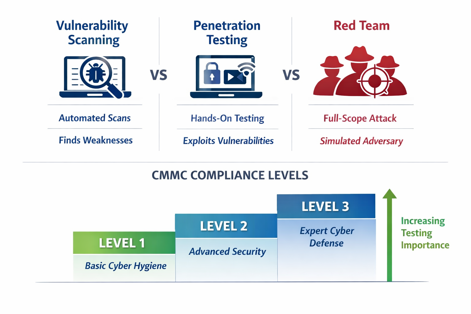 CMMC uses three levels tied to data sensitivity and risk. The most common CMMC pentesting conversations happen at Levels 2 and 3 because they involve CUI and deeper verification.